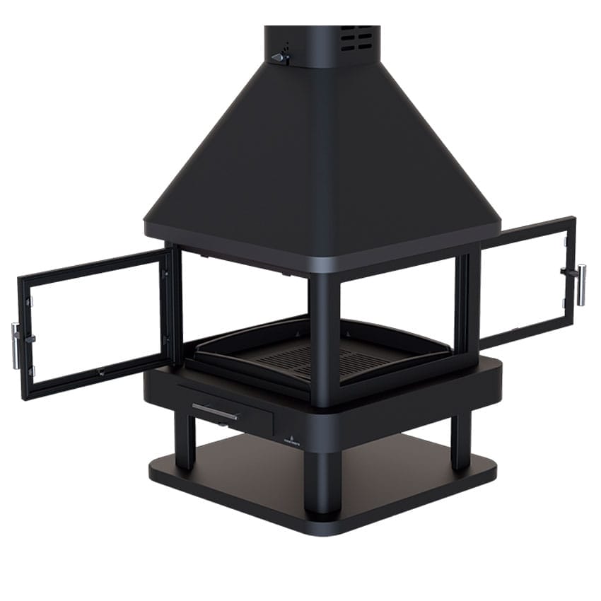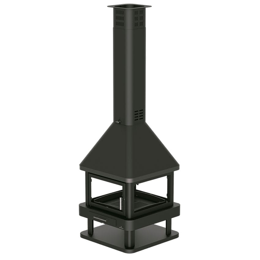 Chimenea pensada para instalación central, con visión del fuego desde cualquier ángulo gracias a su acristalamiento en todos los lados. Además, incorpora un leñero integrado que aporta un extra de comodidad y mantiene la leña siempre a mano, con una presencia muy decorativa en el espacio.