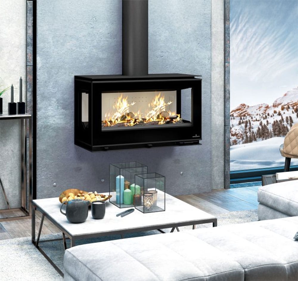 La estufa de leña Bronpi Cairo 90 3C Box destaca por su visión panorámica a tres caras, creando un efecto envolvente muy atractivo mientras aporta un calor homogéneo. Permite elegir interior en vermiculita o Firetek y, con turbina opcional, mejora la circulación del aire para una distribución más uniforme en la estancia.