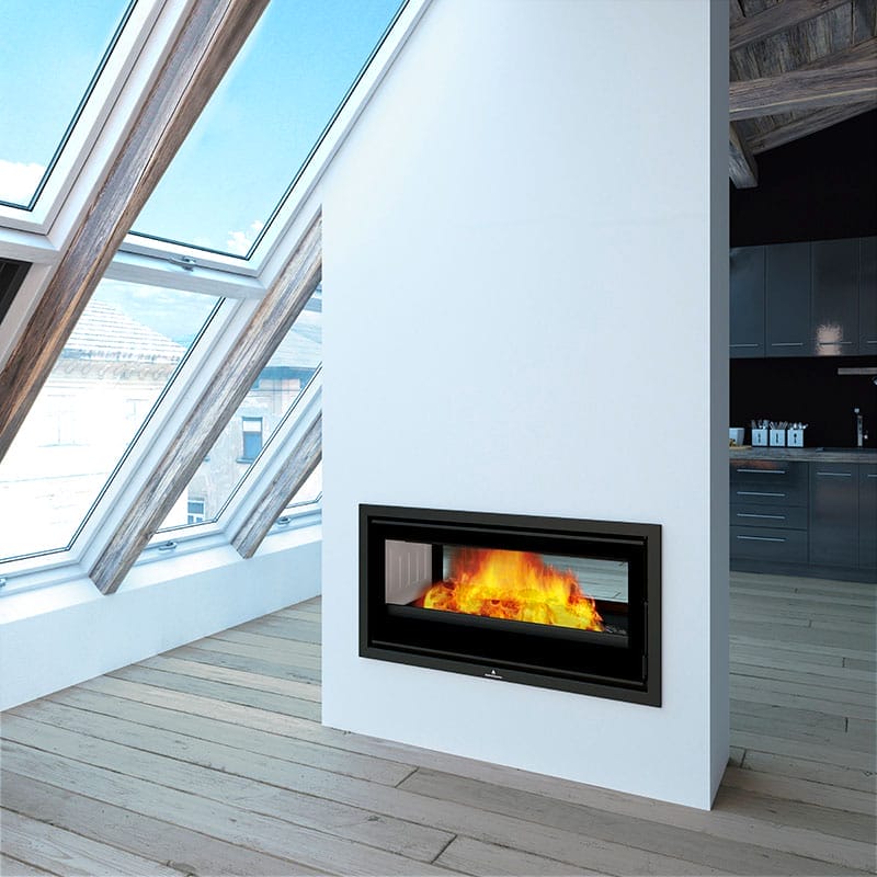 Su diseño de doble cara permite aportar calor a dos estancias de manera simultánea, favoreciendo una sensación térmica homogénea en ambos lados. Una opción muy adecuada para separar ambientes sin perder el protagonismo del fuego.