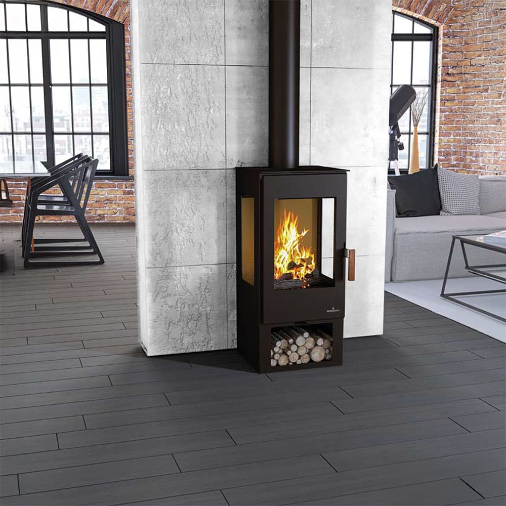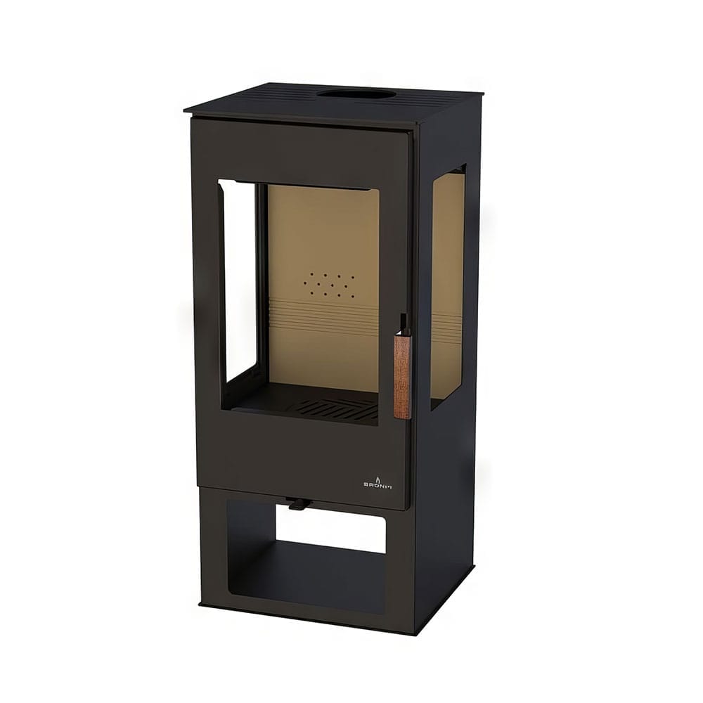 La estufa de leña Bronpi Estrella, de formato vertical con tres cristales y leñero integrado, permite disfrutar de la llama desde varios ángulos mientras mantiene un aporte de calor estable. Con el KIT-AIR-16 opcional puede trabajar en modo estanco, una opción especialmente interesante para viviendas de alta eficiencia.