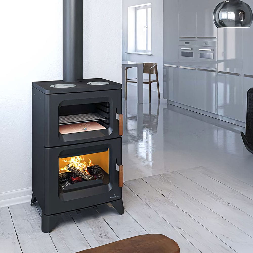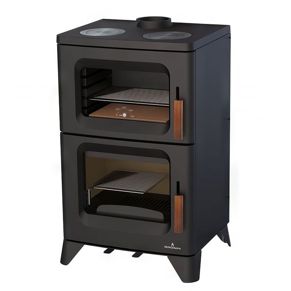 La estufa de leña Bronpi Hilton C, con horno integrado y aros de cocción en fundición, combina calefacción y cocina de leña en un mismo equipo. Ofrece 14 kW de potencia nominal (clase A+) y un 85 % de rendimiento, pensada para mantener un aporte de calor preciso y constante mientras permite cocinar al fuego con un acabado tradicional.