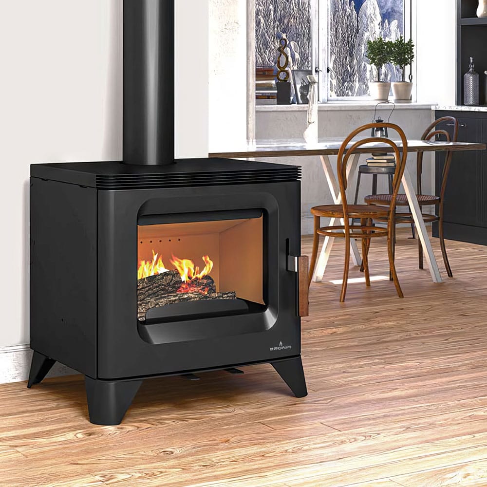 La estufa de leña Bronpi Orly, de formato frontal con puerta y patas en fundición, ofrece una estética sólida y un aporte de calor eficiente para el hogar. Con 6 kW de potencia nominal (clase A+) y un 83 % de rendimiento, está pensada para mantener una calidez estable con un consumo bien aprovechado.