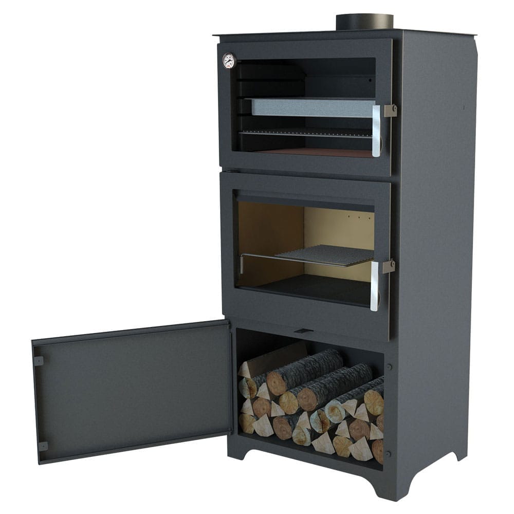 Un modelo de mayor tamaño y capacidad, pensado para quienes desean cocinar en cantidades más grandes sin renunciar a una estética elegante. Su configuración con horno lo convierte en una opción muy completa para hogares donde la cocina de leña tiene protagonismo.