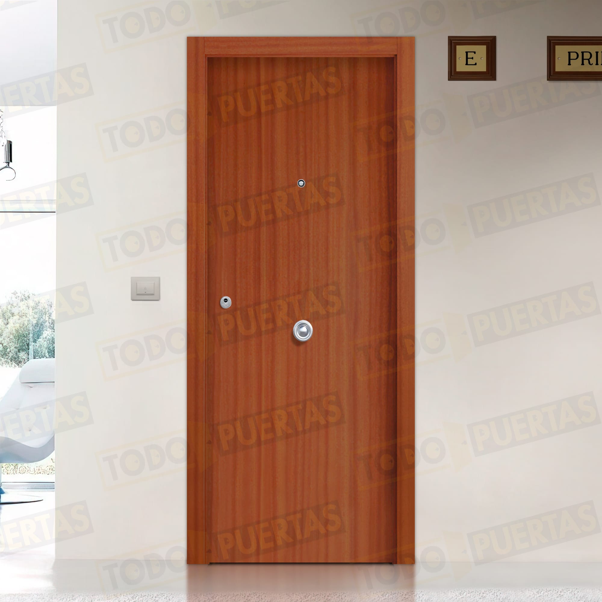 Puerta Blindada en Block con paneles macizos de aglomerado y con un acabado de alta calidad que da gusto tocar, conseguido con una chapa de madera natural y un barniz natural de primera calidad y una garantía total que te incluye hasta el envío.
