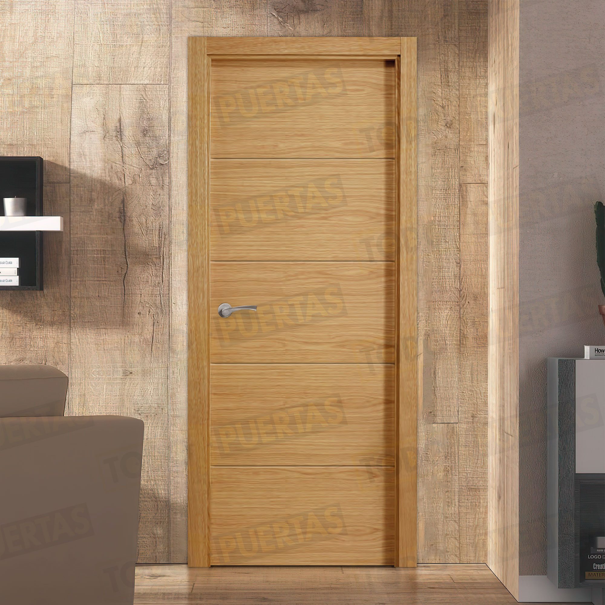 Puerta Block Maciza de Aglomerado con un acabado de alta calidad que da gusto tocar, conseguido con una chapa de madera natural y un barniz natural de primera calidad y una garantía total que te incluye hasta el envío.
