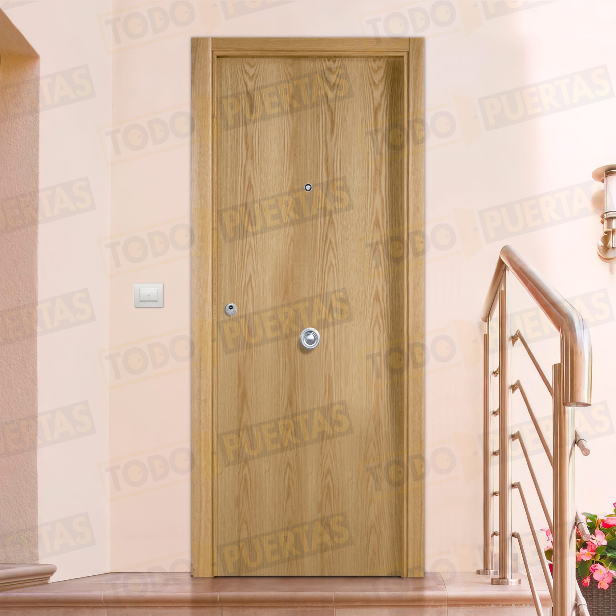 Puerta Blindada en Block con paneles macizos de aglomerado y con un acabado de alta calidad que da gusto tocar, conseguido con una chapa de madera natural y un barniz natural de primera calidad y una garantía total que te incluye hasta el envío.