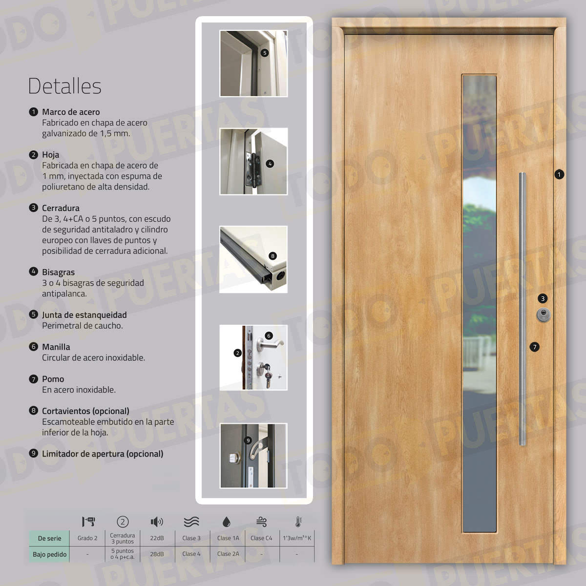 | Tipo Cerradura | De 3 puntos, con escudo de seguridad antitaladro y cilindro europeo con llaves de puntos / De 5 puntos, con escudo de seguridad antitaladro y cilindro europeo con llaves de puntos / De 5 puntos (2 Cerraduras), con escudo de seguridad antitaladro y cilindro europeo con llaves de puntos |