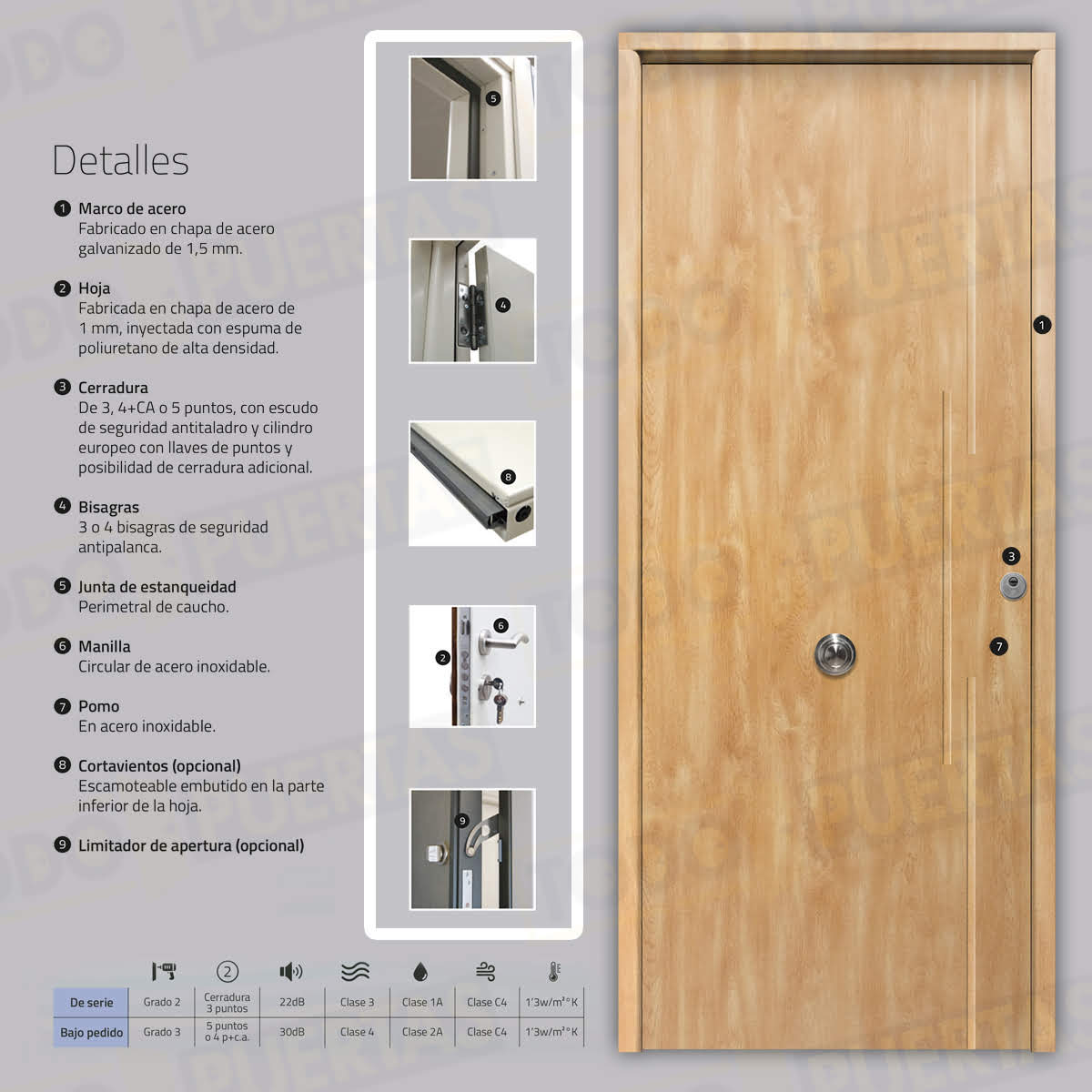 | Material Hoja | Fabricada en chapa de acero de 1 mm, inyectada con espuma de poliuretano de alta densidad. |