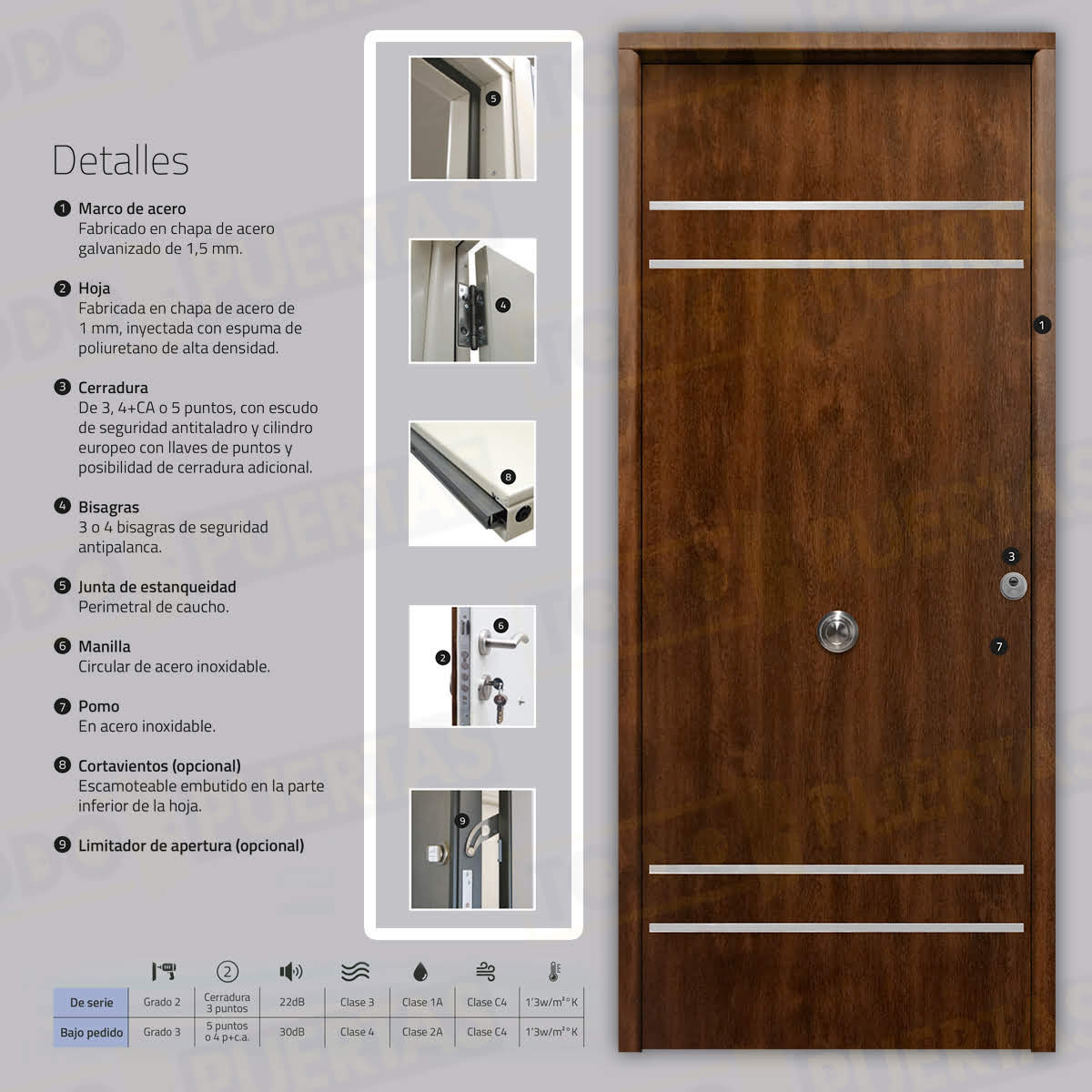 | Extras Opcionales | Cortavientos escamoteable embutido en la parte inferior de la hoja / Abrepuertas Eléctrico / Limitador de apertura / Antiefracción RC3 / Vierteaguas |