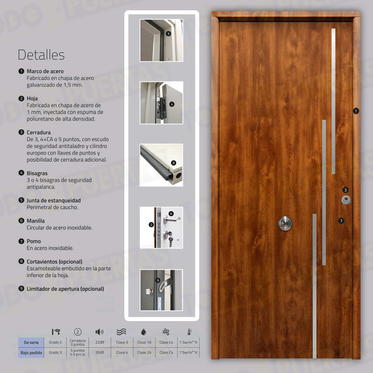 | Tipo Cerradura | De 3 puntos, con escudo de seguridad antitaladro y cilindro europeo con llaves de puntos / De 5 puntos, con escudo de seguridad antitaladro y cilindro europeo con llaves de puntos / De 5 puntos (2 Cerraduras), con escudo de seguridad antitaladro y cilindro europeo con llaves de puntos |