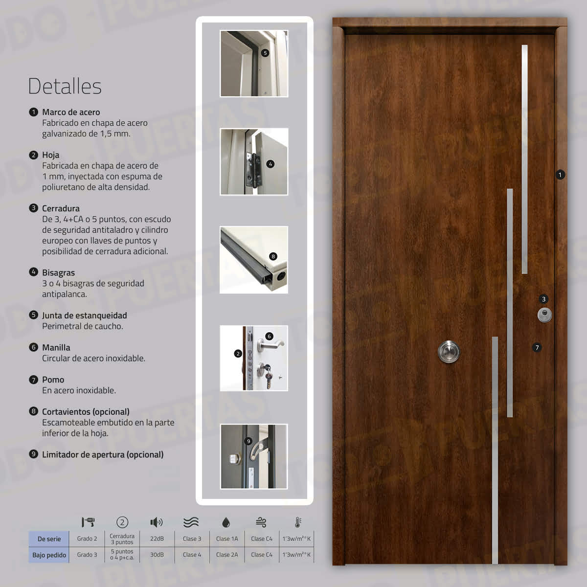 | Extras Opcionales | Cortavientos escamoteable embutido en la parte inferior de la hoja / Abrepuertas Eléctrico / Limitador de apertura / Antiefracción RC3 / Vierteaguas |