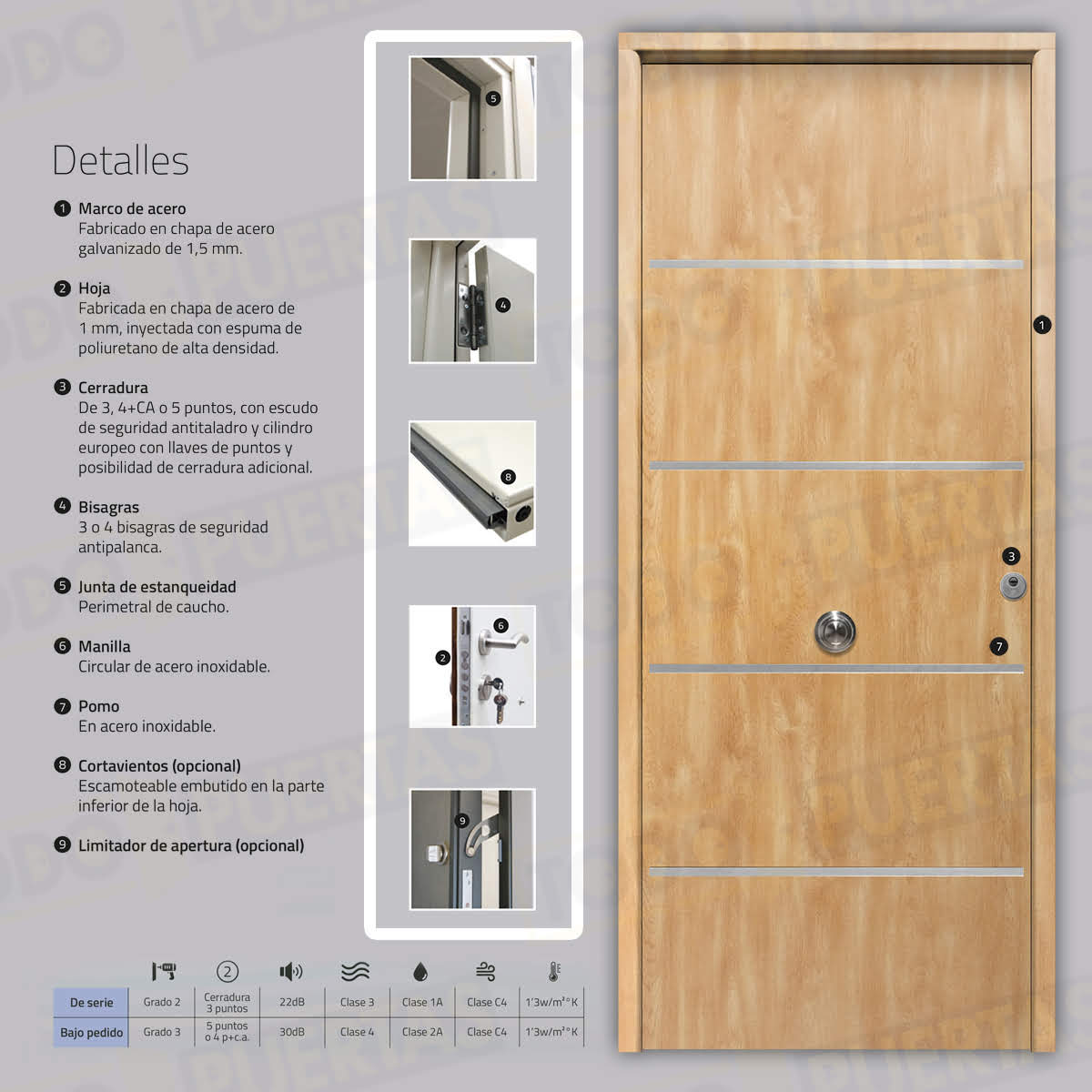| Tipo Cerradura | De 3 puntos, con escudo de seguridad antitaladro y cilindro europeo con llaves de puntos / De 5 puntos, con escudo de seguridad antitaladro y cilindro europeo con llaves de puntos / De 5 puntos (2 Cerraduras), con escudo de seguridad antitaladro y cilindro europeo con llaves de puntos |