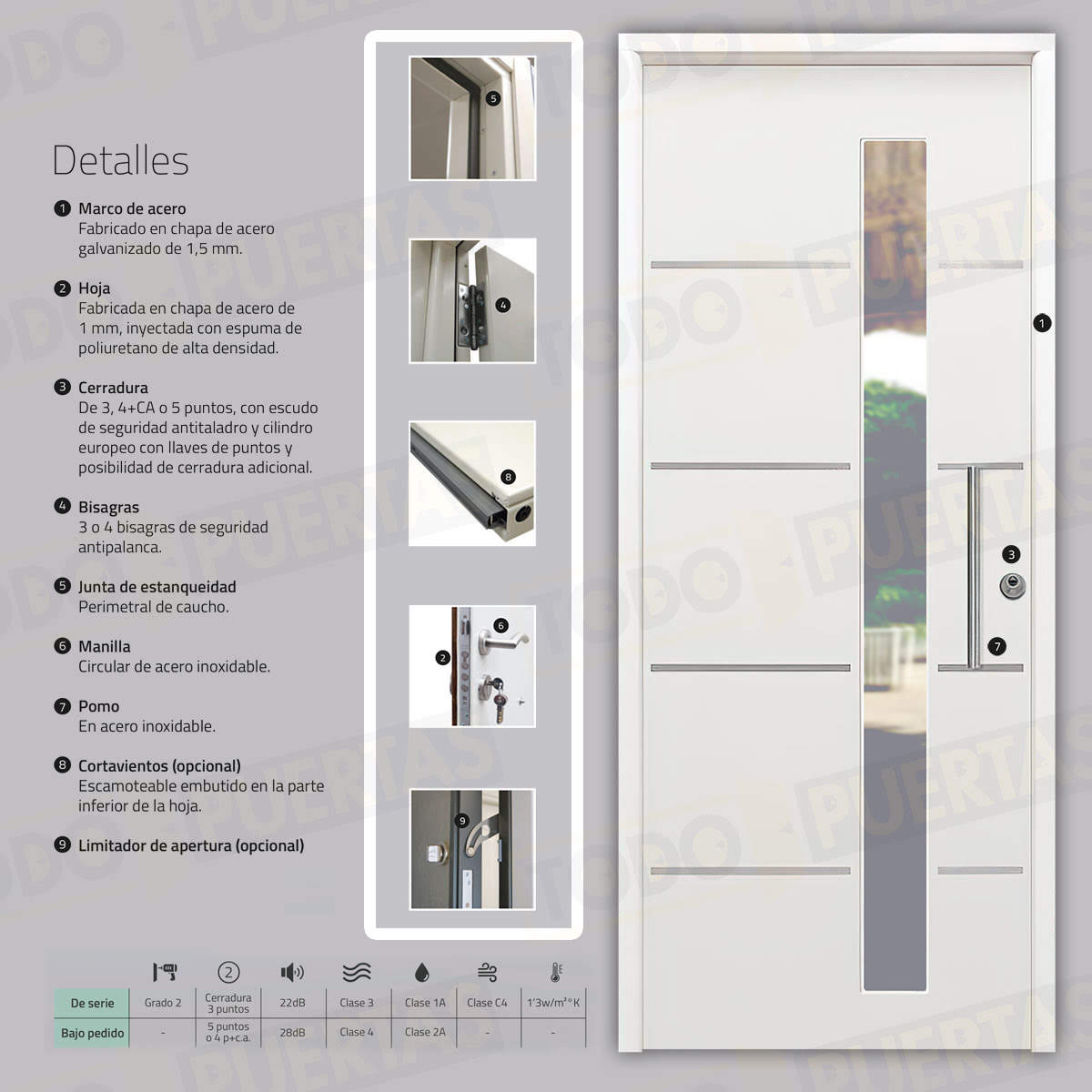 | Tipo Cerradura | De 3 puntos, con escudo de seguridad antitaladro y cilindro europeo con llaves de puntos / De 5 puntos, con escudo de seguridad antitaladro y cilindro europeo con llaves de puntos / De 5 puntos (2 Cerraduras), con escudo de seguridad antitaladro y cilindro europeo con llaves de puntos |