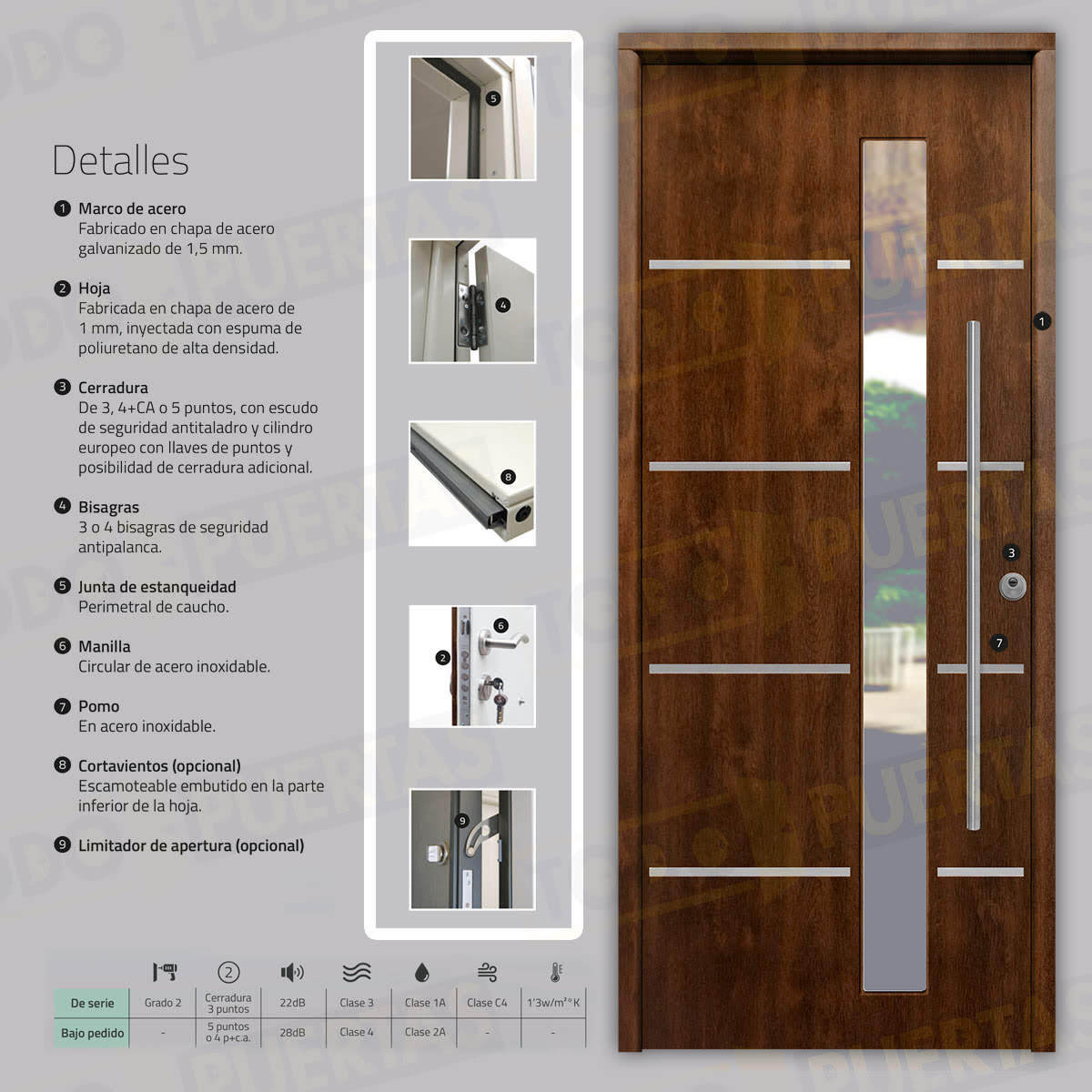 | Tipo Cerradura | De 3 puntos, con escudo de seguridad antitaladro y cilindro europeo con llaves de puntos / De 5 puntos, con escudo de seguridad antitaladro y cilindro europeo con llaves de puntos / De 5 puntos (2 Cerraduras), con escudo de seguridad antitaladro y cilindro europeo con llaves de puntos |