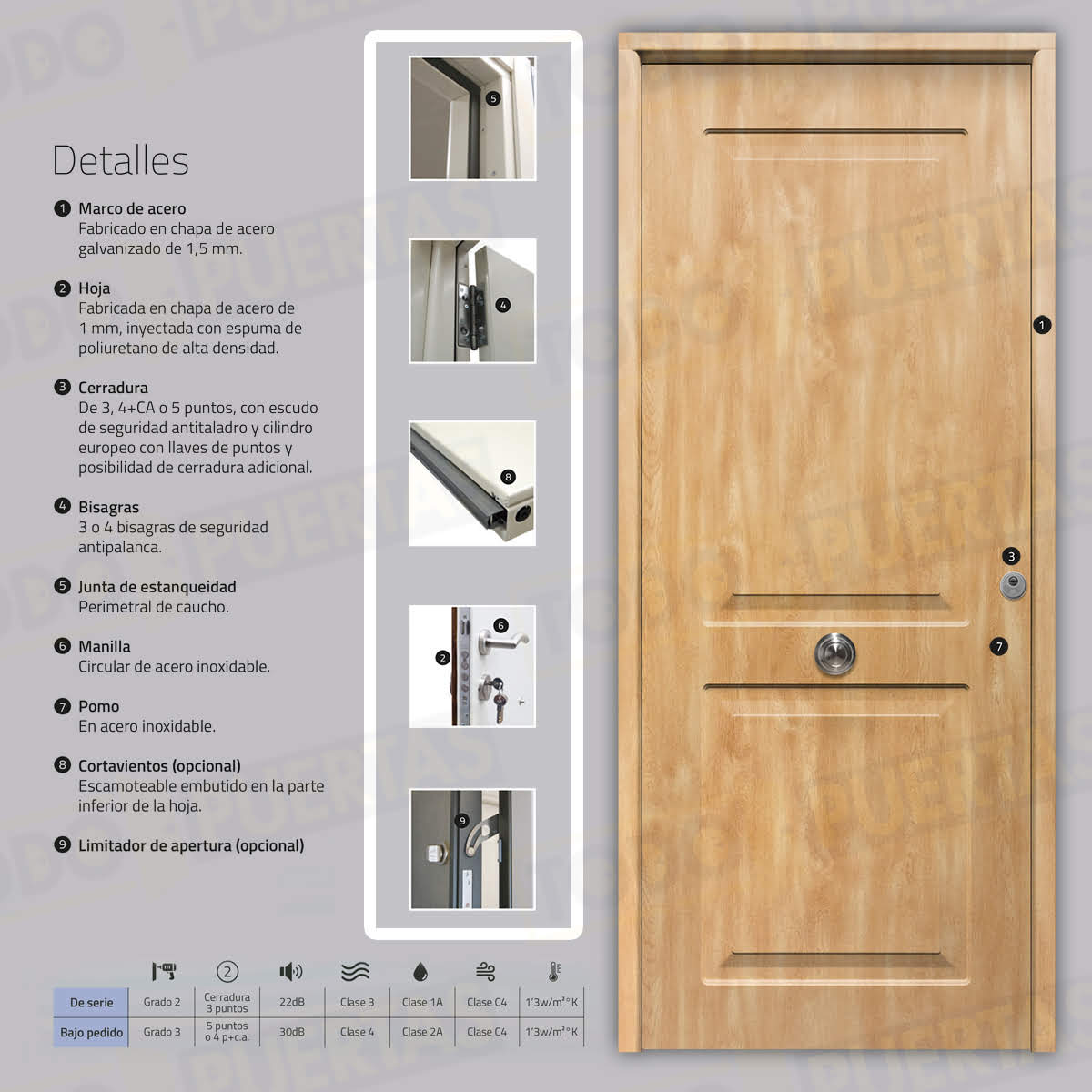 | Material Hoja | Fabricada en chapa de acero de 1 mm, inyectada con espuma de poliuretano de alta densidad. |