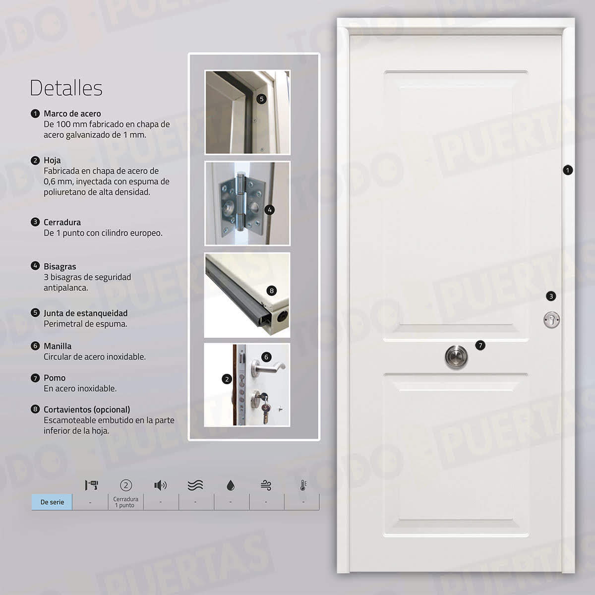 | Material Hoja | Fabricada en chapa de acero de 0,6 mm, inyectada con espuma de poliuretano de alta densidad |