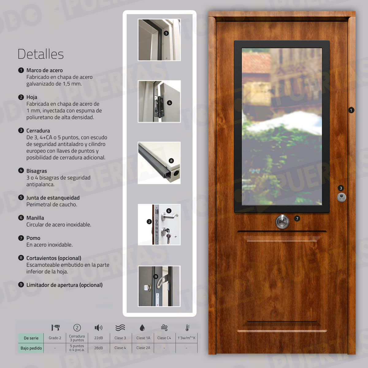 | Bisagras | Tres o Cuatro bisagras de seguridad antipalanca |