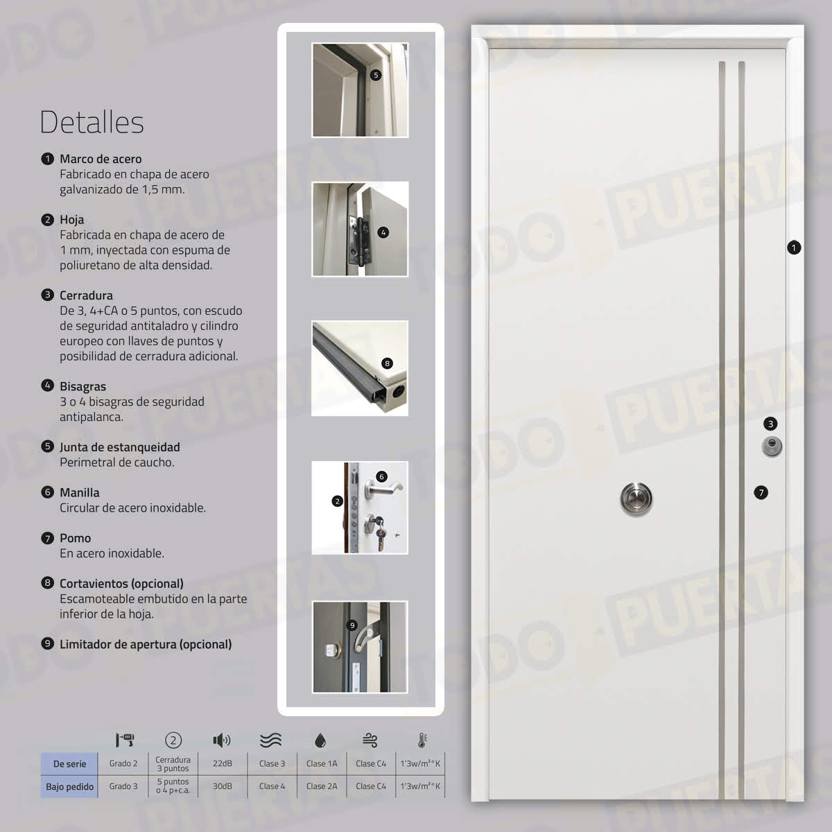| Extras Opcionales | Cortavientos escamoteable embutido en la parte inferior de la hoja / Abrepuertas Eléctrico / Limitador de apertura / Antiefracción RC3 / Vierteaguas |