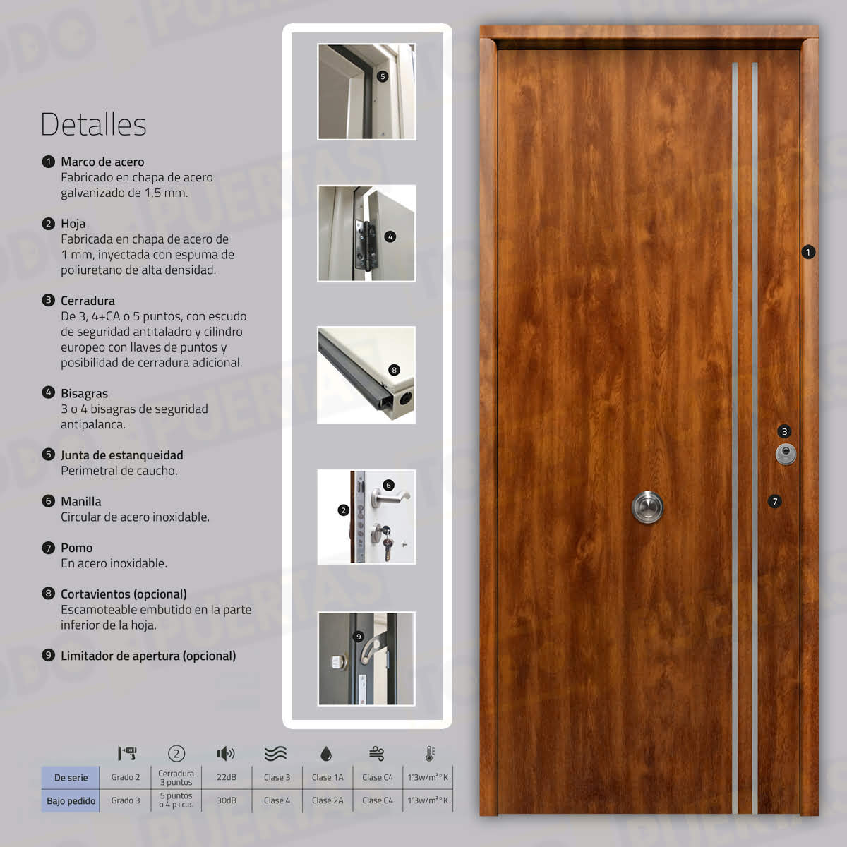 | Extras Opcionales | Cortavientos escamoteable embutido en la parte inferior de la hoja / Abrepuertas Eléctrico / Limitador de apertura / Antiefracción RC3 / Vierteaguas |