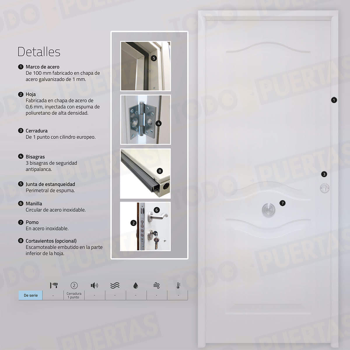 | Material Hoja | Fabricada en chapa de acero de 0,6 mm, inyectada con espuma de poliuretano de alta densidad |