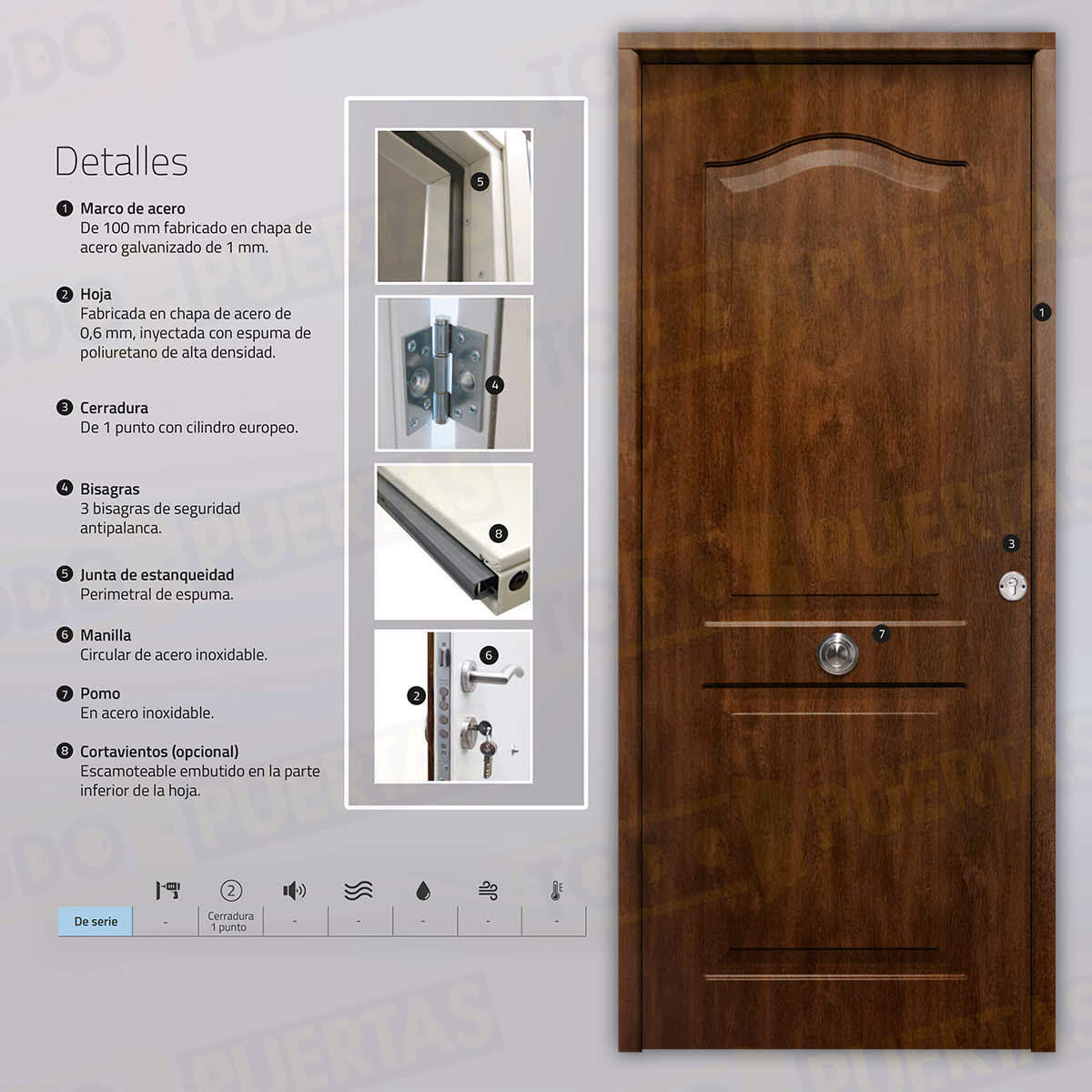 | Material Hoja | Fabricada en chapa de acero de 0,6 mm, inyectada con espuma de poliuretano de alta densidad |
