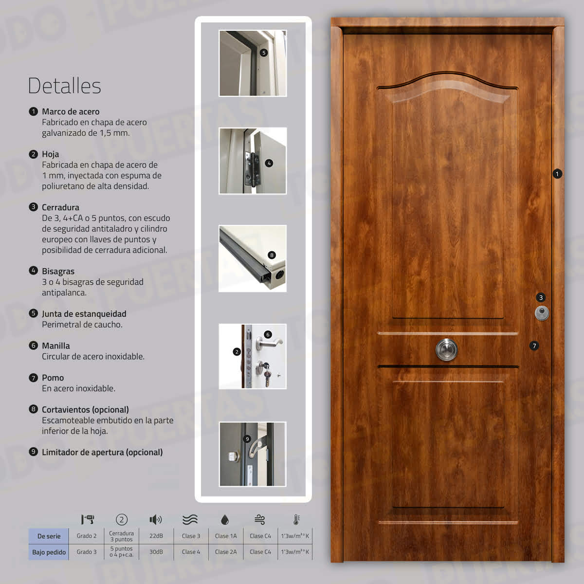 | Material Hoja | Fabricada en chapa de acero de 1 mm, inyectada con espuma de poliuretano de alta densidad. |