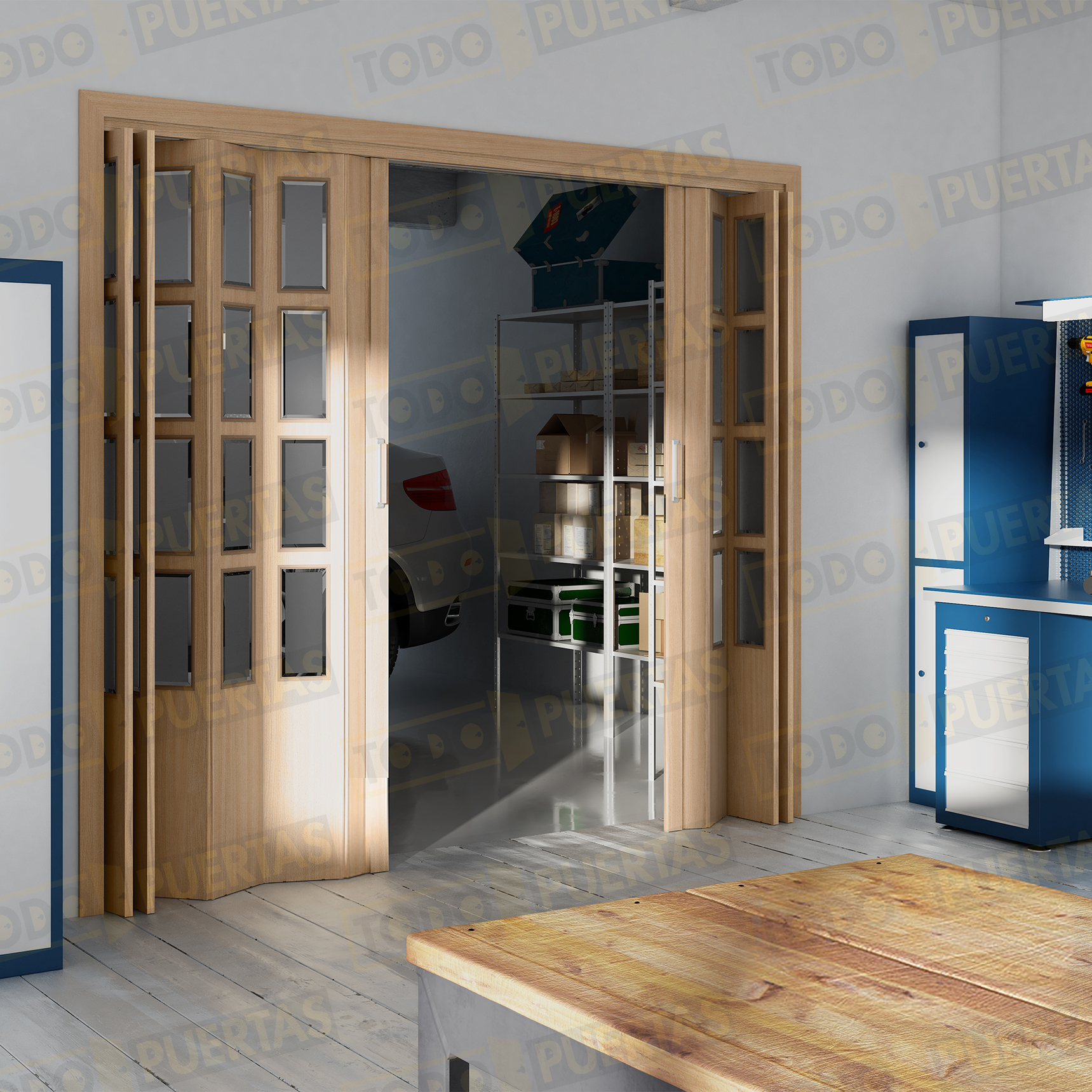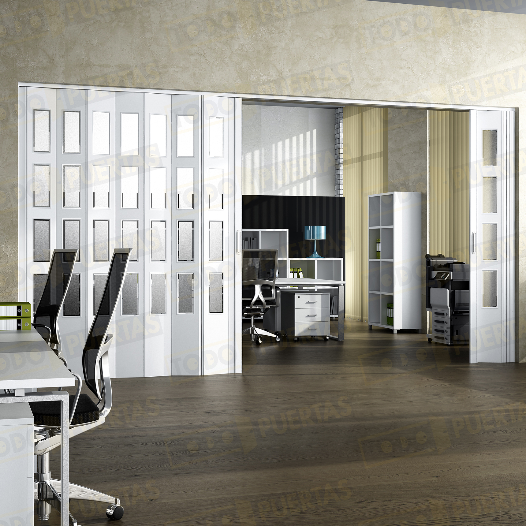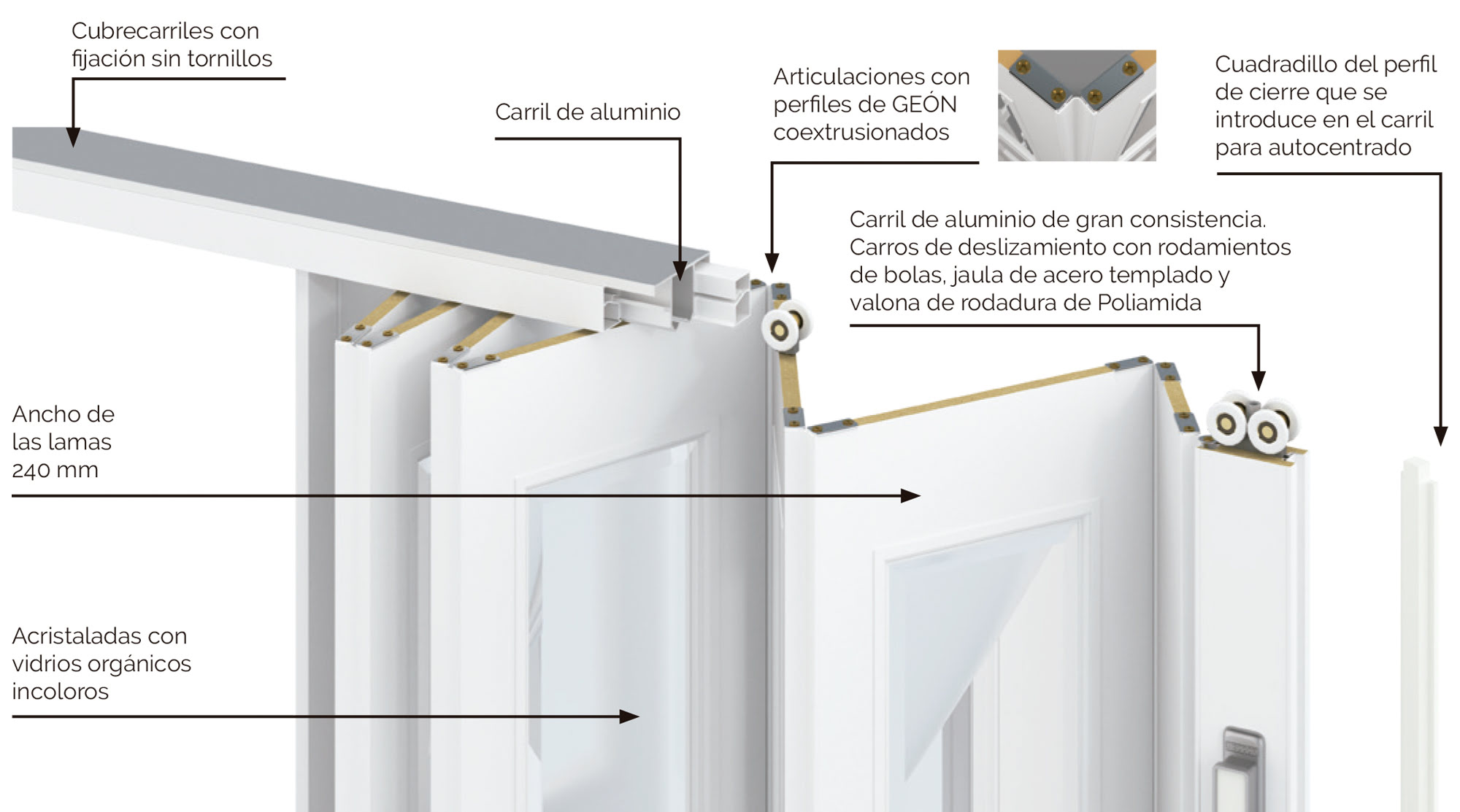 La puerta se suministra con Cierre Magnético con Placas Polarizadas Pivotantes, Tirador de ABS con Baño de Oro Lacado o Cromo Mate, Lamas Acristaladas con Vidrios Orgánicos Incoloros y Carril de Aluminio de gran consistencia y Carros de Deslizamiento con Rodamientos de Bolas, Jaula de Acero Templado y Balona de Rodadura de Poliamida. El Cubrecarril se fija sin necesidad de usar tornillos.