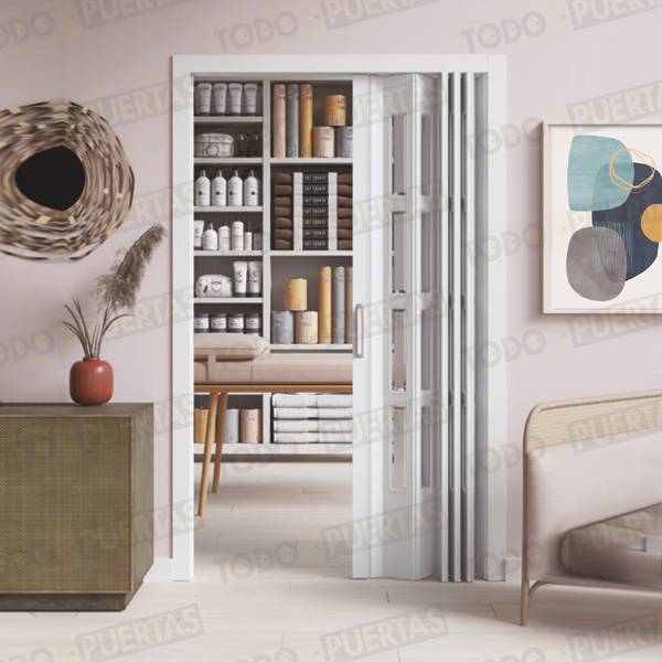 La puerta se suministra con Cierre Magnético con Placas Polarizadas Pivotantes, Tirador de ABS con Baño de Oro Lacado o Cromo Mate, Lamas Acristaladas con Vidrios Orgánicos Incoloros y Carril de Aluminio y Carros de Deslizamiento con Ruedas de Acetal. El Cubrecarril se fija sin necesidad de usar tornillos.