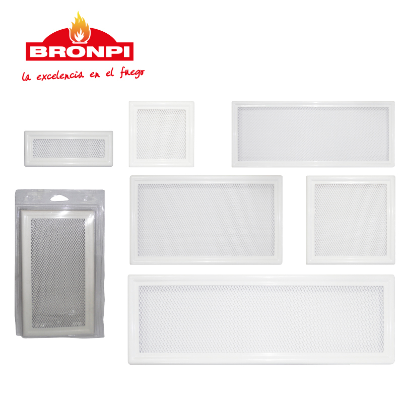 Rejilla de malla en color blanco, indicada para favorecer la ventilación y rematar la instalación de la chimenea o estufa con un acabado sencillo y discreto.