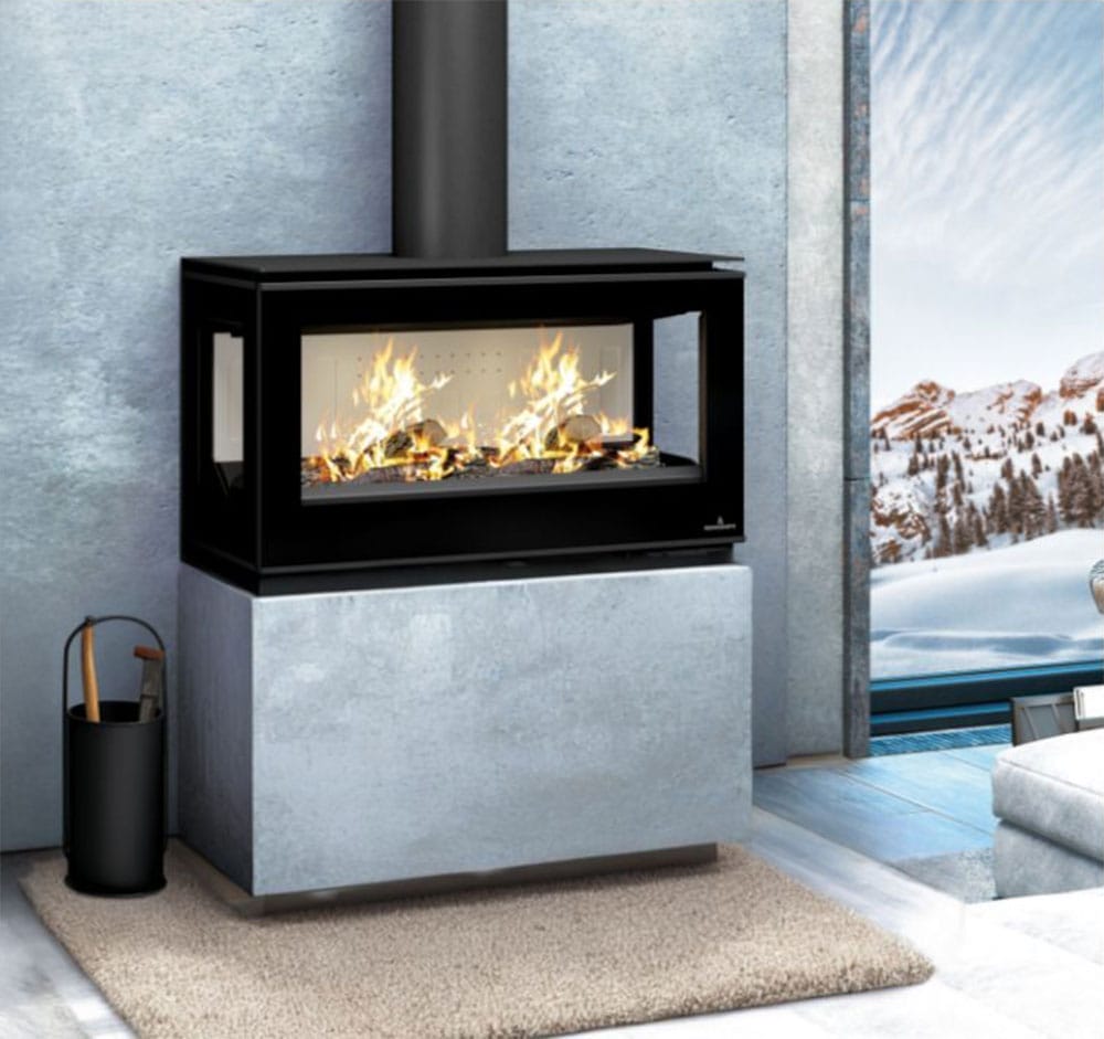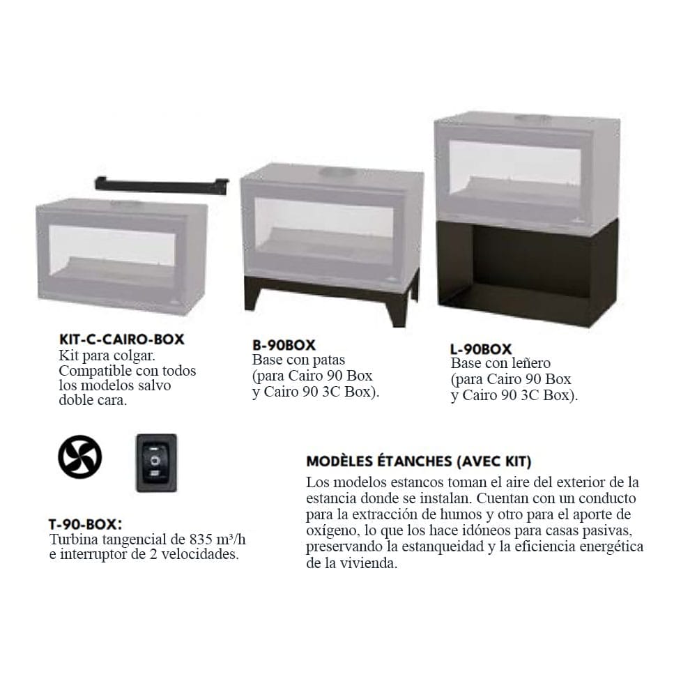 La estufa de leña Bronpi Cairo 90 3C Box destaca por su visión panorámica a tres caras, creando un efecto envolvente muy atractivo mientras aporta un calor homogéneo. Permite elegir interior en vermiculita o Firetek y, con turbina opcional, mejora la circulación del aire para una distribución más uniforme en la estancia.