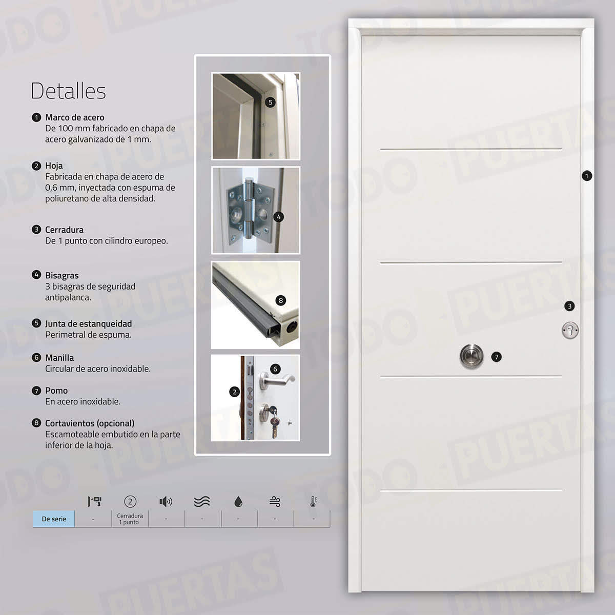 | Material Hoja | Fabricada en chapa de acero de 0,6 mm, inyectada con espuma de poliuretano de alta densidad |