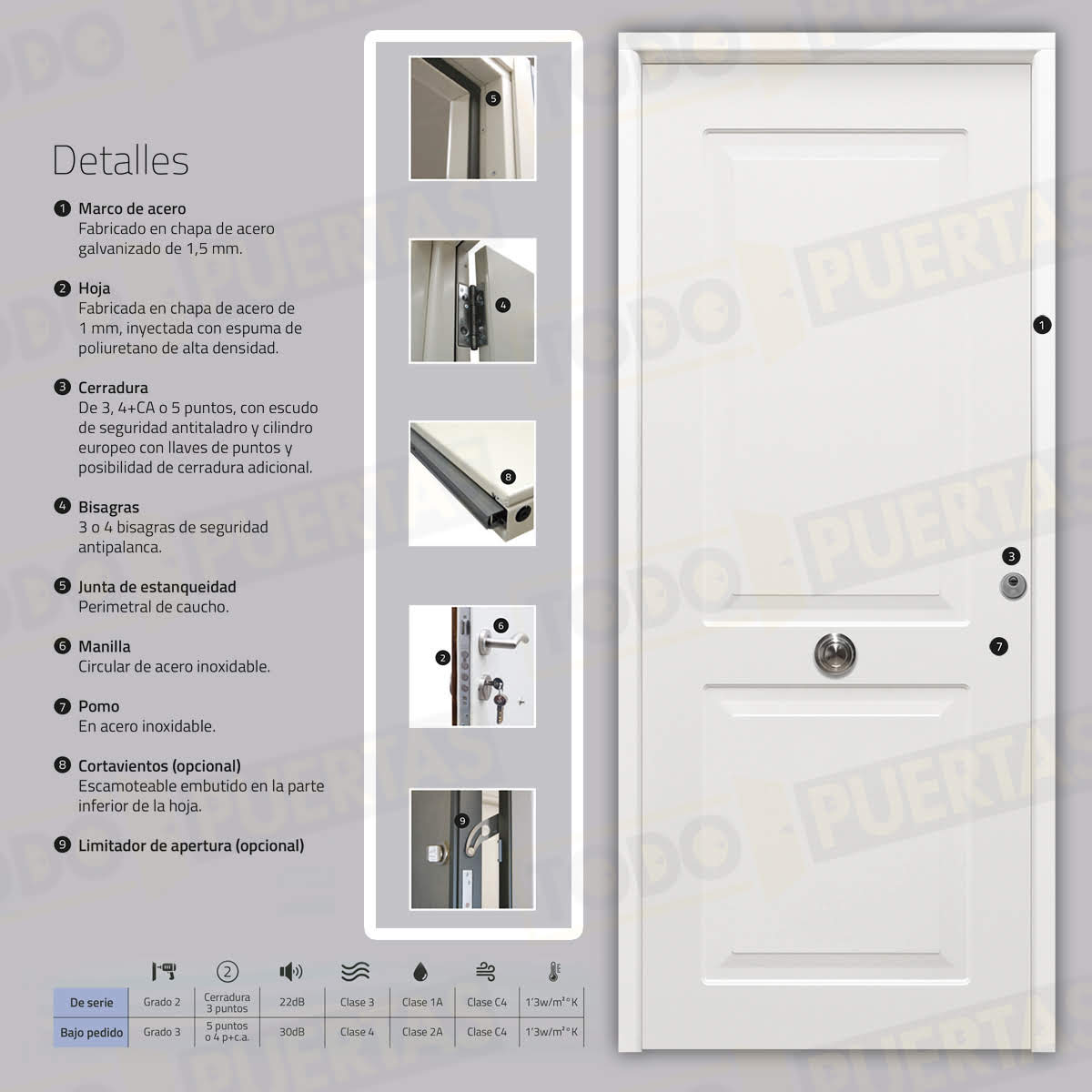 | Material Hoja | Fabricada en chapa de acero de 1 mm, inyectada con espuma de poliuretano de alta densidad. |