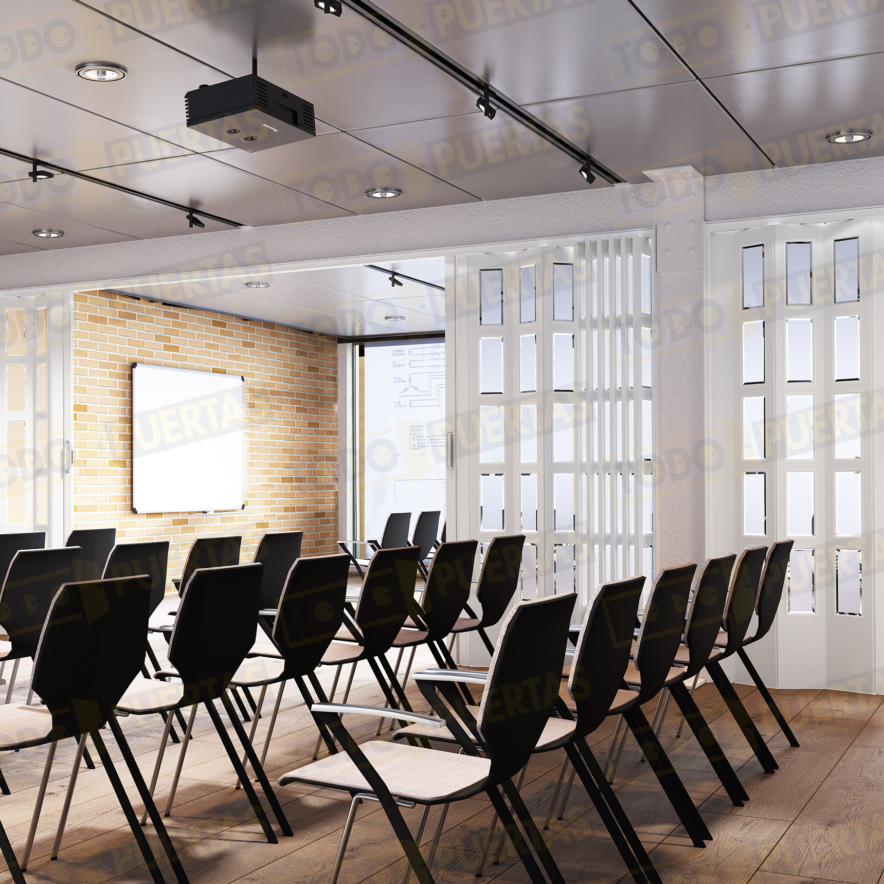 La puerta se suministra con Cierre Magnético con Placas Polarizadas Pivotantes, Tirador de ABS con Baño de Oro Lacado o Cromo Mate, Lamas Acristaladas con Vidrios Orgánicos Incoloros y Carril de Aluminio de gran consistencia y Carros de Deslizamiento con Rodamientos de Bolas, Jaula de Acero Templado y Balona de Rodadura de Poliamida. El Cubrecarril se fija sin necesidad de usar tornillos.