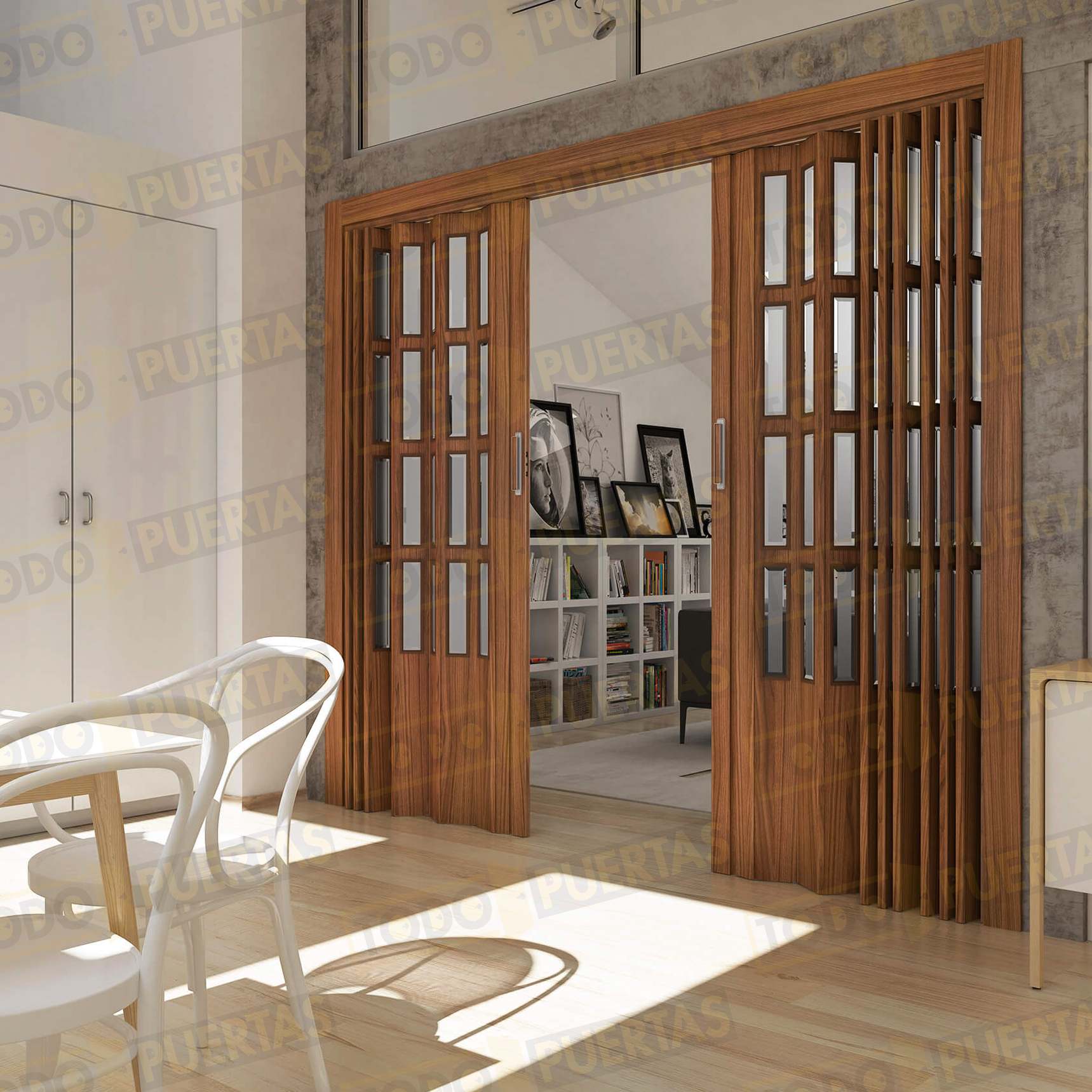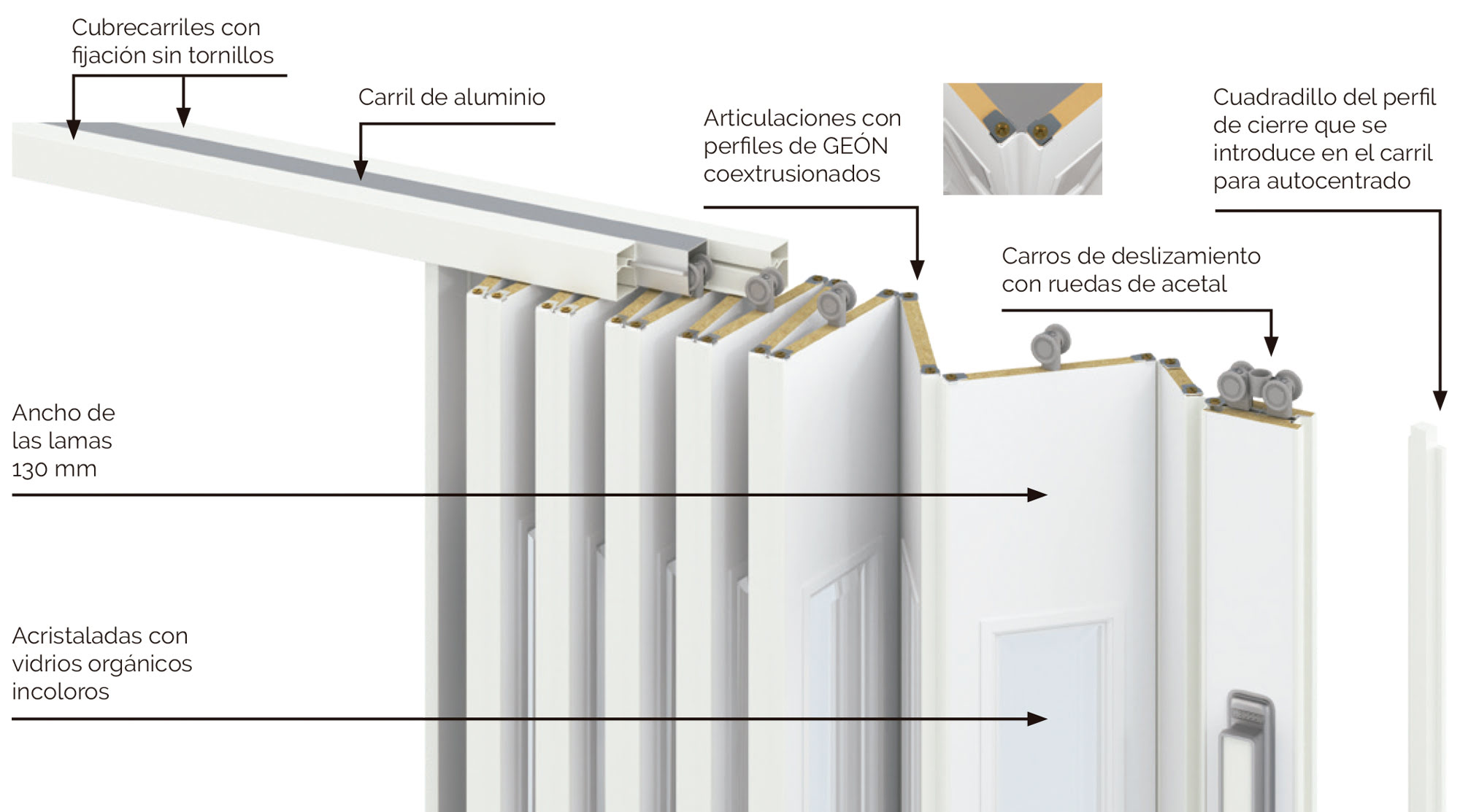 La puerta se suministra con Cierre Magnético con Placas Polarizadas Pivotantes, Tirador de ABS con Baño de Oro Lacado o Cromo Mate, Lamas Acristaladas con Vidrios Orgánicos Incoloros y Carril de Aluminio y Carros de Deslizamiento con Ruedas de Acetal. El Cubrecarril se fija sin necesidad de usar tornillos.