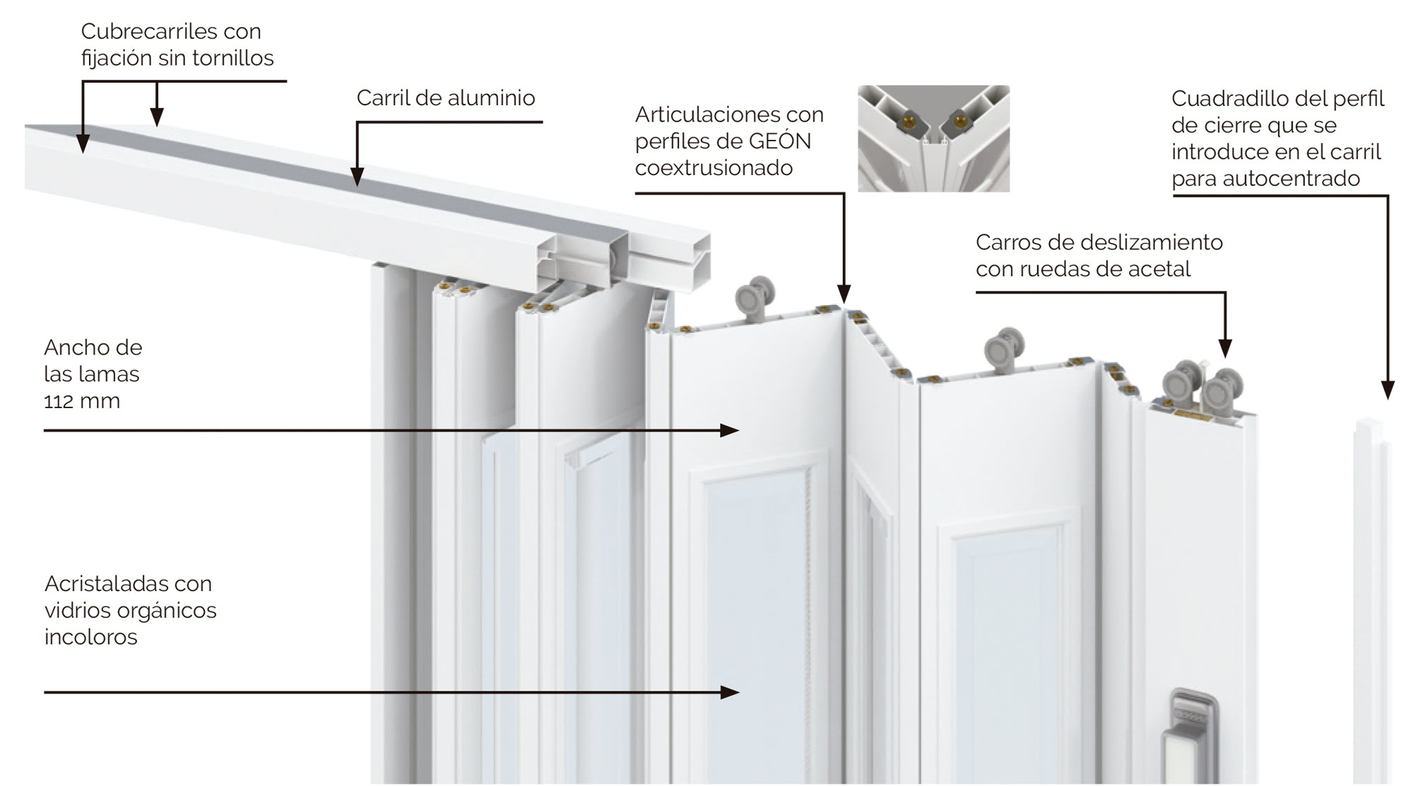 La puerta se suministra con Cierre Magnético con Placas Polarizadas Pivotantes, Tirador de ABS Marrón con fijación oculta, Lamas Acristaladas con Vidrios Orgánicos Incoloros y Carril de Aluminio y Carros de Deslizamiento con Ruedas de Acetal. El Cubrecarril se fija sin necesidad de usar tornillos.